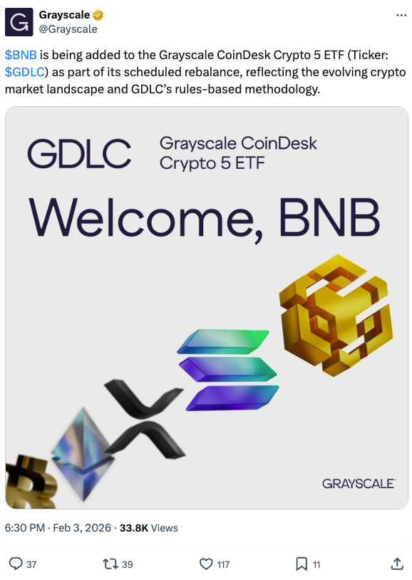 灰度将BNB纳入其Crypto 5 ETF:灰度已正式将BNB纳入其CoinDesk Crypto 5 ETF,这显示出机构对该资产的强烈信心。此次纳入使得BNB与比特币、以太坊等其他主要资产一同出现在这一广泛交易的投资产品中。