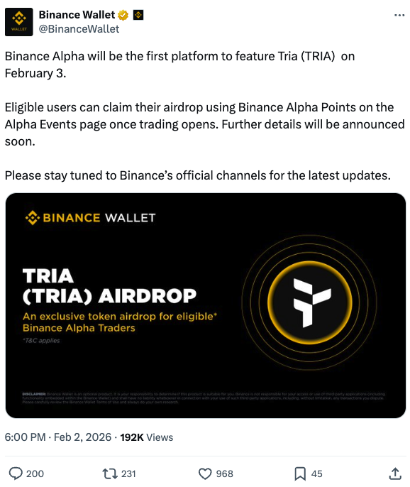 Tria代币上线:主打用户体验的第一层区块链Tria推出了其原生代币TRIA,并在币安Alpha平台首发并登陆KuCoin进行全球首秀。此次发行将41%的代币分配给了社区,但初始流通供应量仍较低,约为22%。