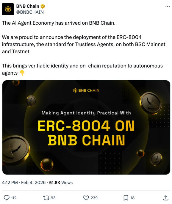 ERC-8004助推AI智能体经济发展:继BAP-578标准之后,BNB Chain进一步部署了ERC-8004基础设施,以更好地支持"智能体经济"。此次升级增强了AI智能体与去中心化金融协议自主交互的能力。