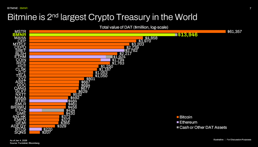 根据一份日期为2026年1月5日的披露文件,Bitmine表示,截至2026年1月4日,其数字资产、现金储备和早期投资的总价值约为142亿美元。
