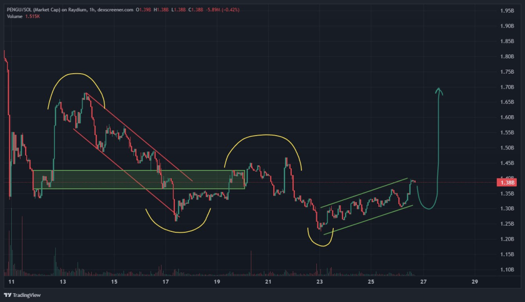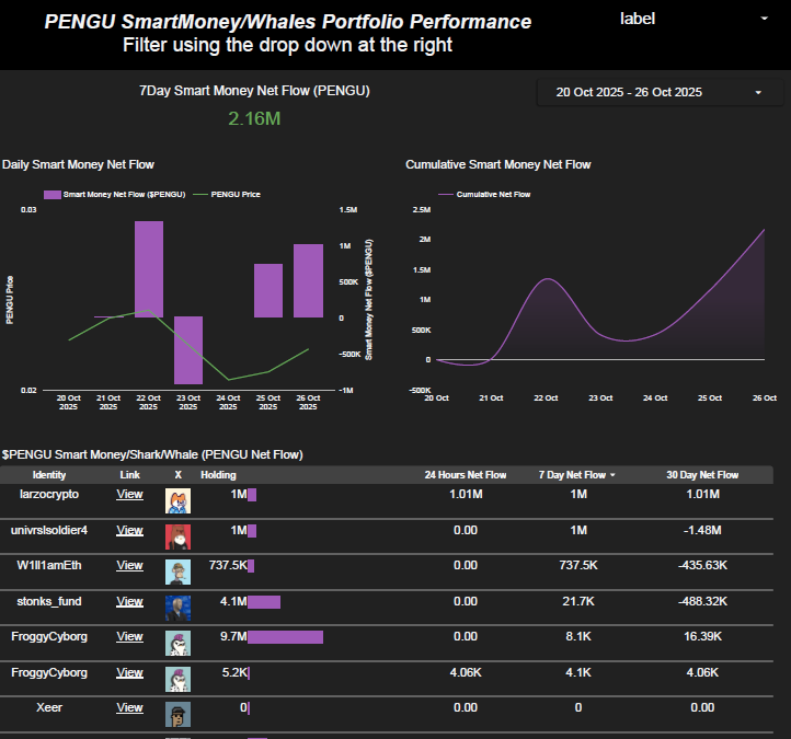 链上数据显示大额持有者正在持续吸筹。"yolow11l等巨鲸钱包在过去几个交易时段稳定增持PENGU",分析师指出。过去七日市场新增超216万枚PENGU代币,表明机构投资者信心增强。