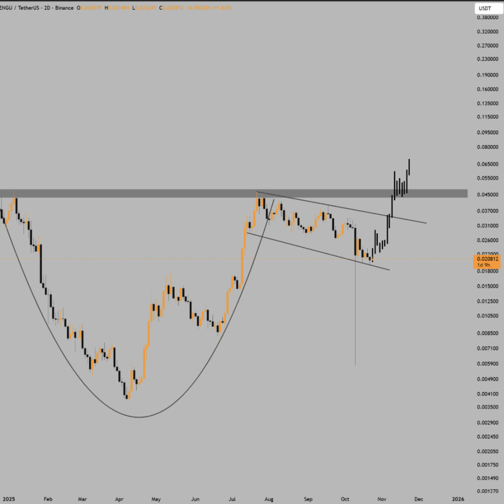 PENGU价格图表呈现典型的杯柄形态,该技术结构通常预示上涨行情。0.035至0.038美元颈线位置的突破得到成交量配合,表明多头重掌主动权。"放量突破显示后续上涨潜力",技术分析师强调。