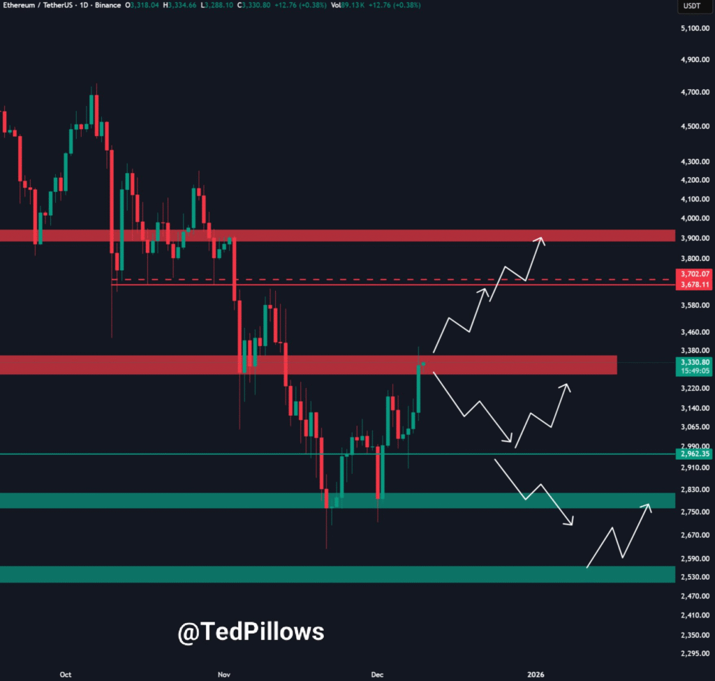 以太坊目前正在测试一个关键阻力位,这对短期价格走势至关重要。该加密货币正面临3300-3400美元价格区间的关键考验。