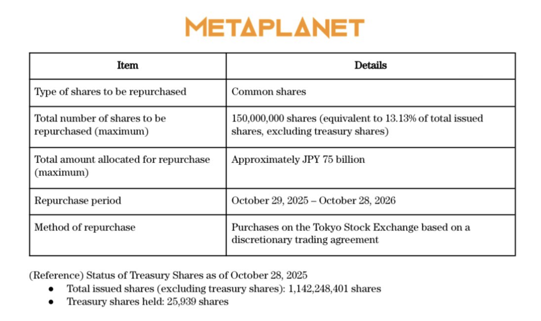 该计划有效期至2026年10月29日,拟回购股份占总股本13.13%。Metaplanet表示若市净率跌破1.0倍将加速回购。约750亿日元(4.95亿美元)的专项资金未来也可用于战略投资。