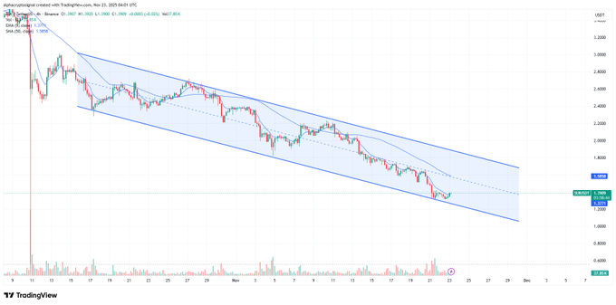 SUI持续在维持数周的宽幅下降通道内运行,经历长期回调后价格现处于通道下轨附近,这种技术形态往往催生阶段性反弹行情。通道上下轨持续发挥效力的现象,表明市场处于交易者可精准把控的有序趋势中。