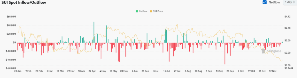 SUI现货资金流入/流出图表显示全年频繁出现红色柱状图,表明持续的资金外流态势。此类行为通常与卖压减轻相关,但SUI在资金外流背景下仍稳步下跌,说明长期下跌趋势中需求持续疲软。这种资金流动创造了流动性逐步抽离的市场背景。