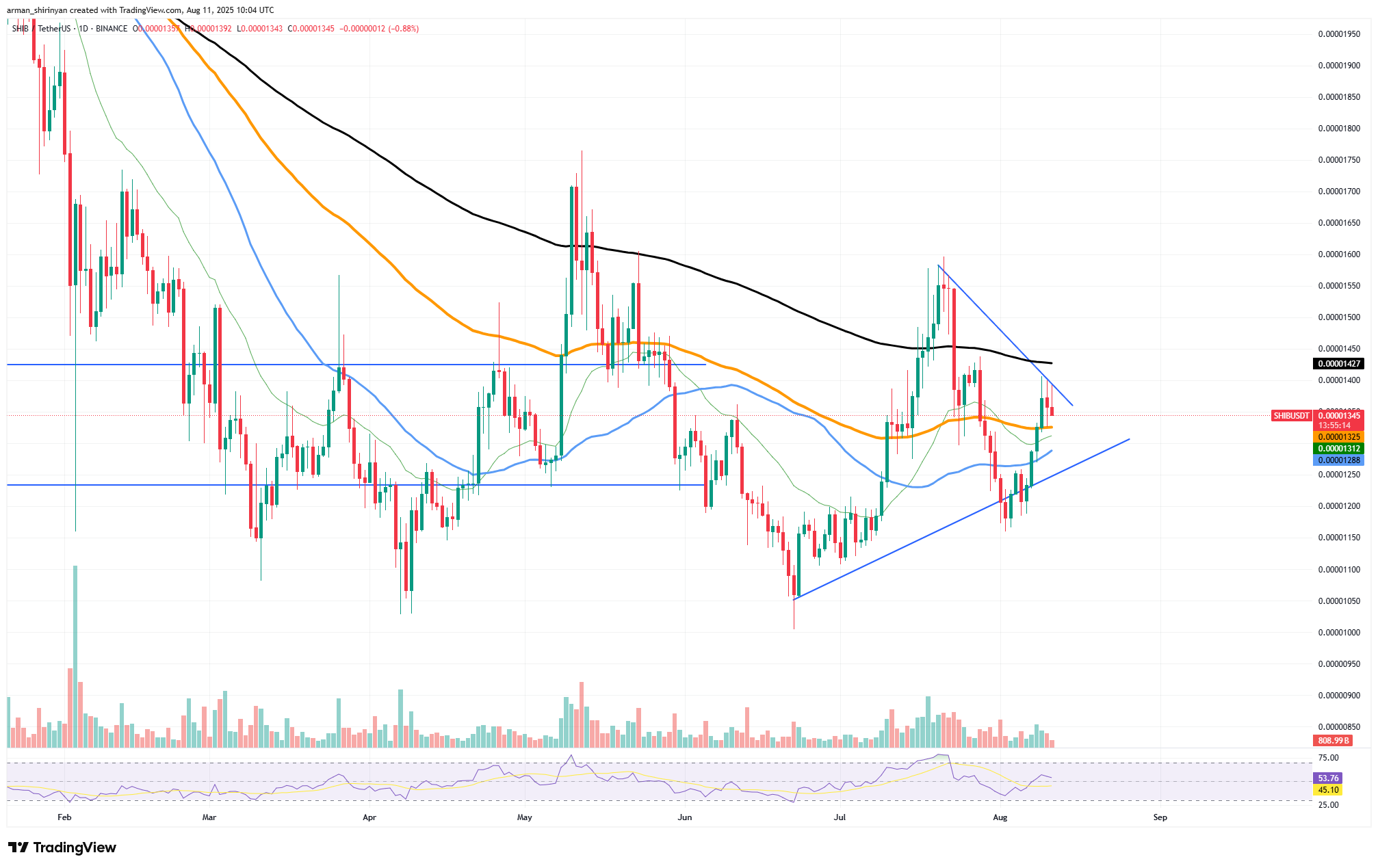 近期柴犬币价格在局部下降趋势线处遭遇的拒绝是一个重大挫折,表明看涨动能难以持续,且交易者尚未准备好支持当前涨势。这条自7月下旬高点以来持续压制SHIB价格的趋势线,在市场价格回升至0.00001420美元后形成了强劲阻力。