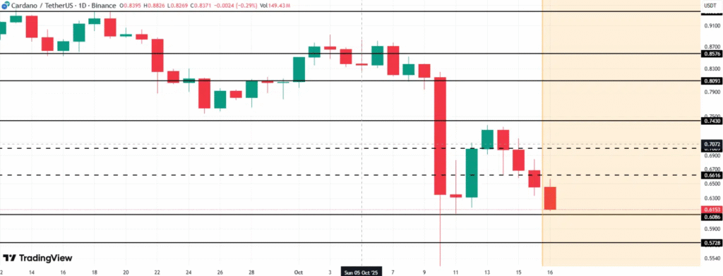 尽管面临鲸鱼带来的看跌压力,散户对ADA的兴趣仍在上升。卡尔达诺近期价格走势确认了其下行趋势的延续。截至2025年10月17日,ADA跌破0.66美元关键支撑位,此次下跌与加密货币市场整体疲软走势一致,比特币和瑞波币同样承受下行压力。