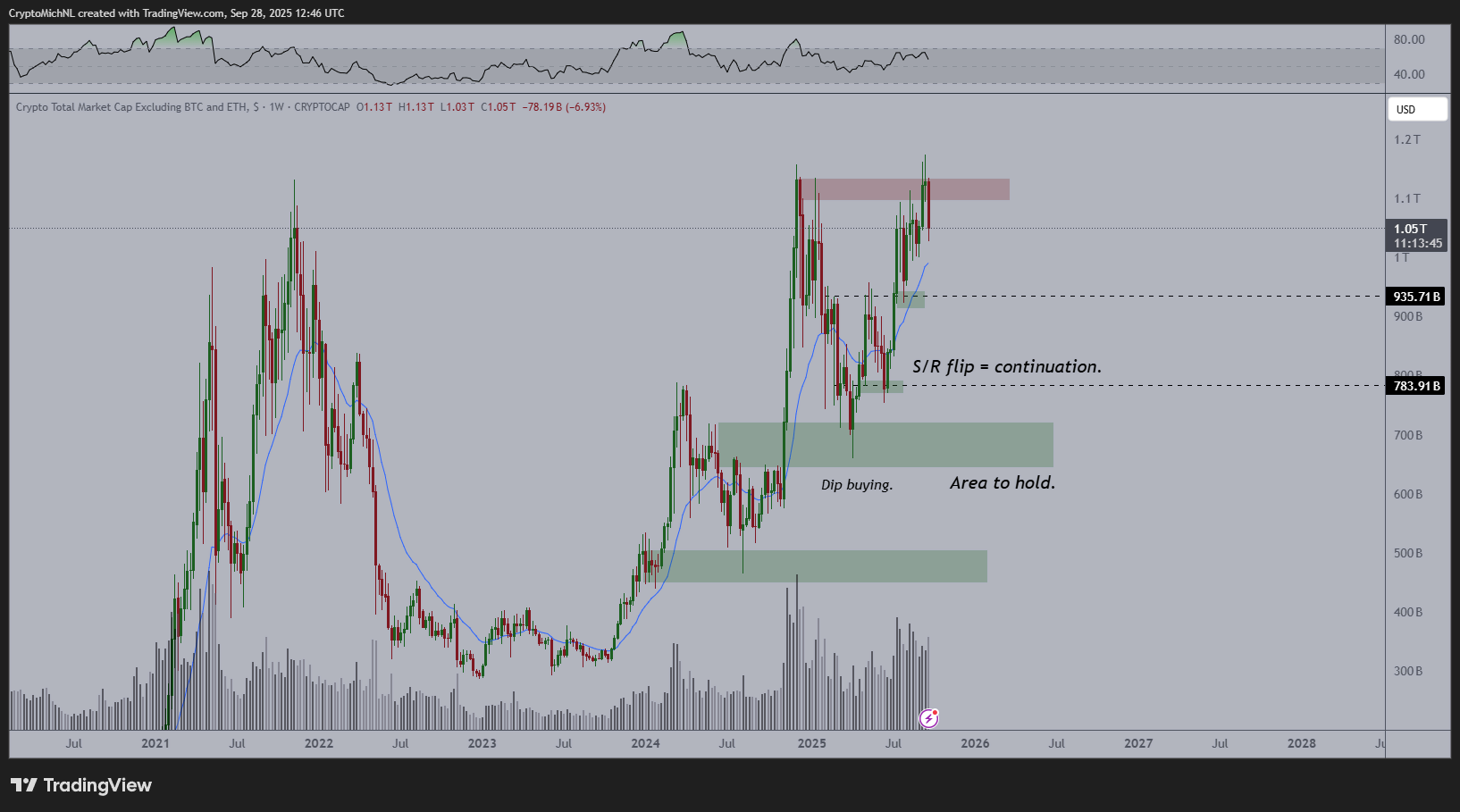 尽管遭遇阻力,分析师认为这可能是山寨币突破关键阻力位并创下历史新高前的最后一次回撤。知名分析师van de Poppe在最新市场评论中强调,山寨币整体市值仍处于强劲上升趋势中。虽然当前受阻显示短期疲软,但只要守住支撑位,市场结构仍暗示涨势将持续。
