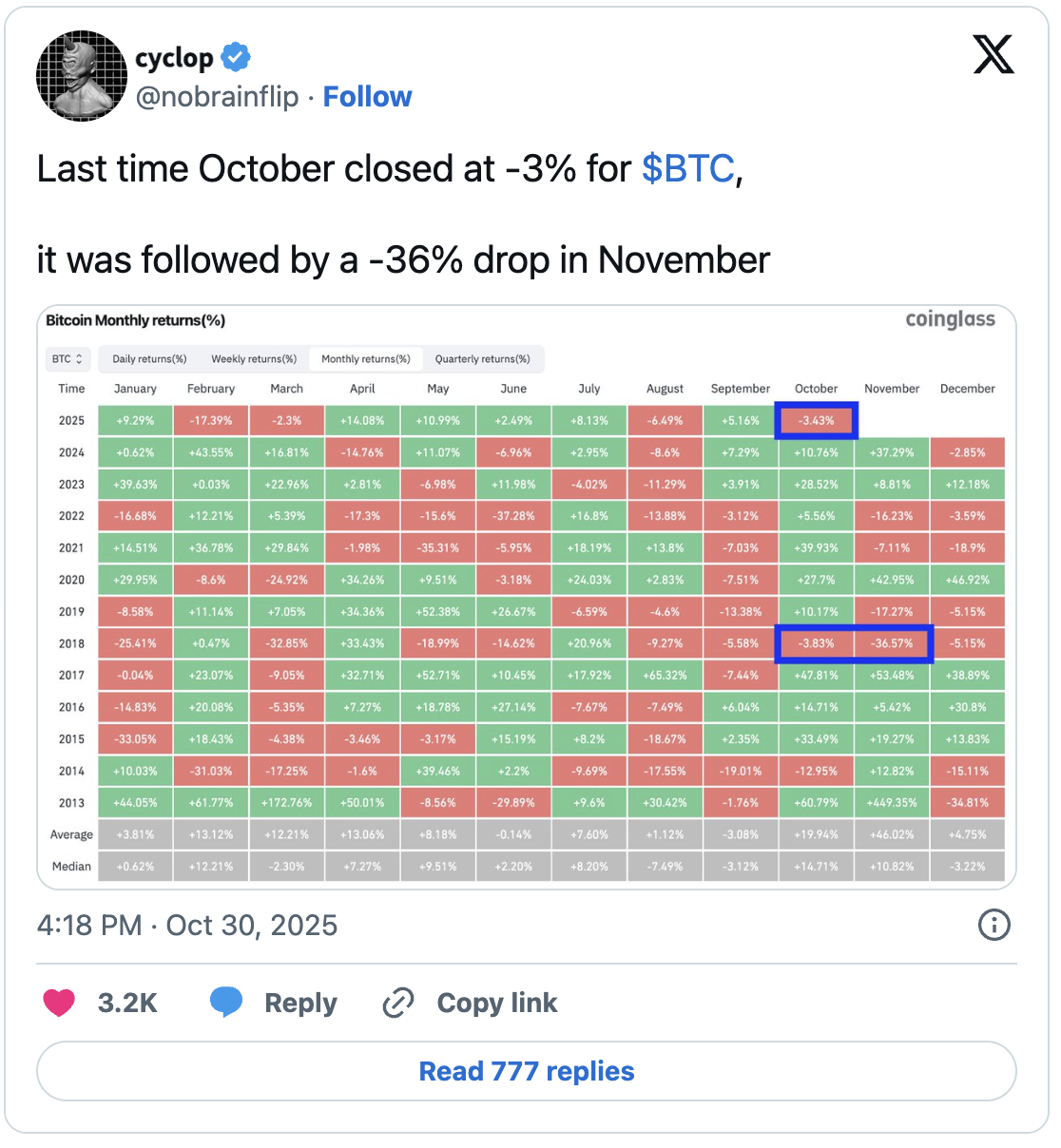 10月10日,比特币在多个交易所价格从12.1万美元骤降至10.1万美元。虽短暂尝试反弹,但一周后再度跌至10.4万美元。这次下跌引发了市场恐慌。尽管存在低通胀数据、美联储潜在降息、中美贸易利好消息等积极因素,比特币仍以小幅下跌结束了十月行情。这个传统意义上的"牛市月份",终结了比特币连续六年十月收阳的历史纪录。
