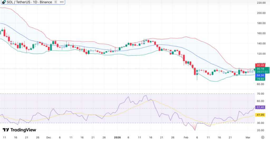 截至发稿,Solana交易价格为90.20美元,24小时内下跌7.4%,正测试周度区间上沿。该代币从77.47美元附近的七日低点反弹后,曾触及90.68美元。尽管近期出现反弹,Solana过去一个月仍累计下跌12%,较2025年1月293.31美元的历史高点下跌近70%。