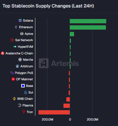 Artemis分析数据显示,Solana与以太坊在稳定币24小时净流入量上并列领先,其他主要公链则呈现净流出或微量流动状态。