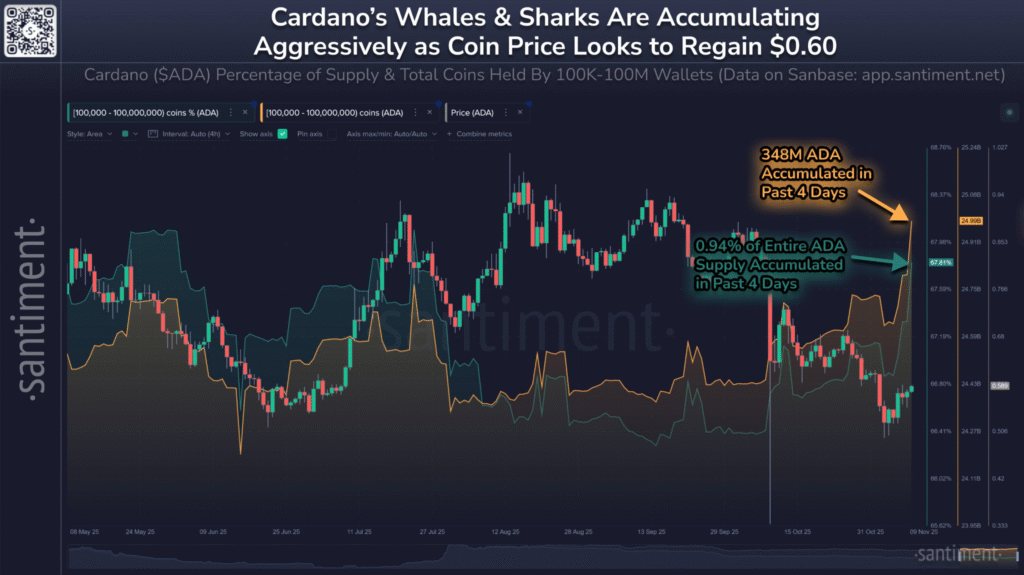 在短短四天内,卡尔达诺(Cardano)巨鲸与鲨鱼级投资者累计增持3.48亿枚ADA代币,价值约2.043亿美元。这一数字占ADA代币总流通量的0.94%。尽管当前ADA价格已跌破0.6美元关口,大额投资者仍对其未来表现保持信心。
