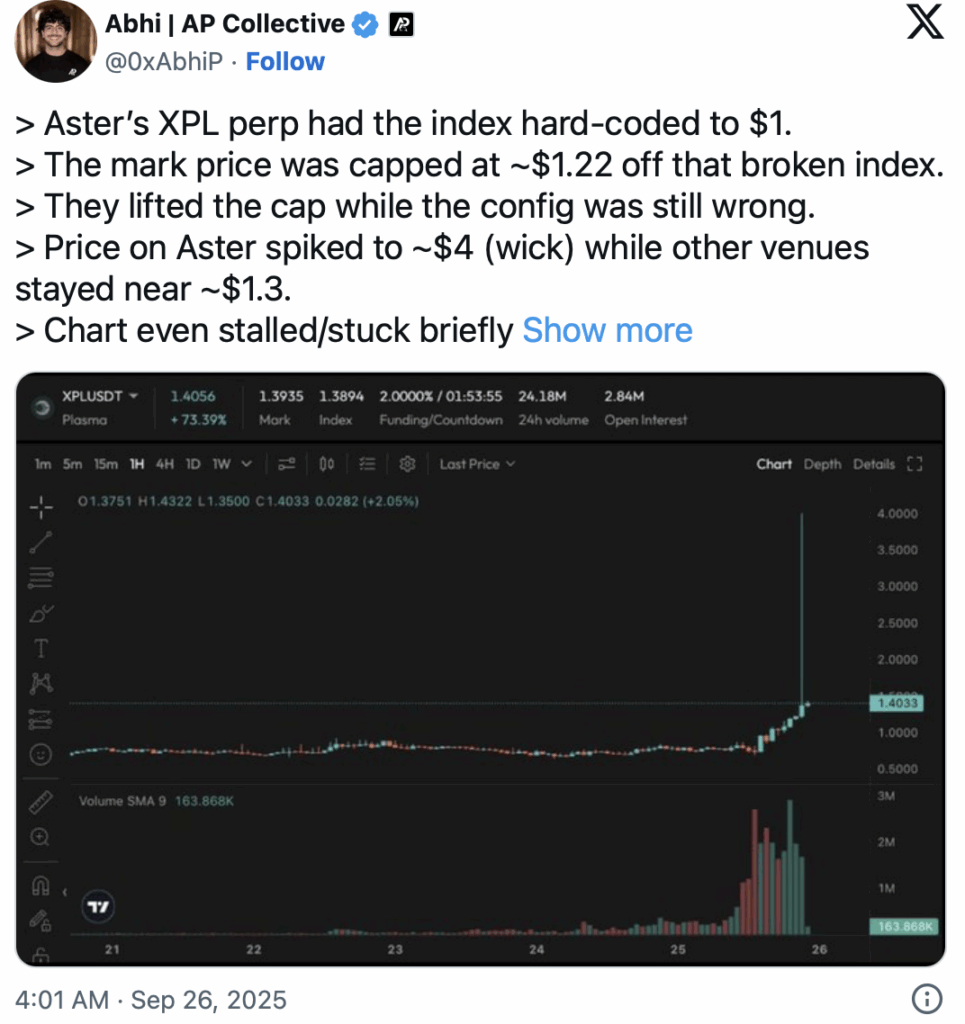 与此同时,基于BNB链的Aster交易所已完成其Plasma(XPL)永续合约市场技术故障的赔付工作。Web3机构AP Collective首席执行官Abhishek Pawa指出,问题源于1美元的硬编码指数配置错误。当Aster解除标记价格上限后,导致XPL期货在其他平台交易价1.3美元时,其价格飙升至近4美元。