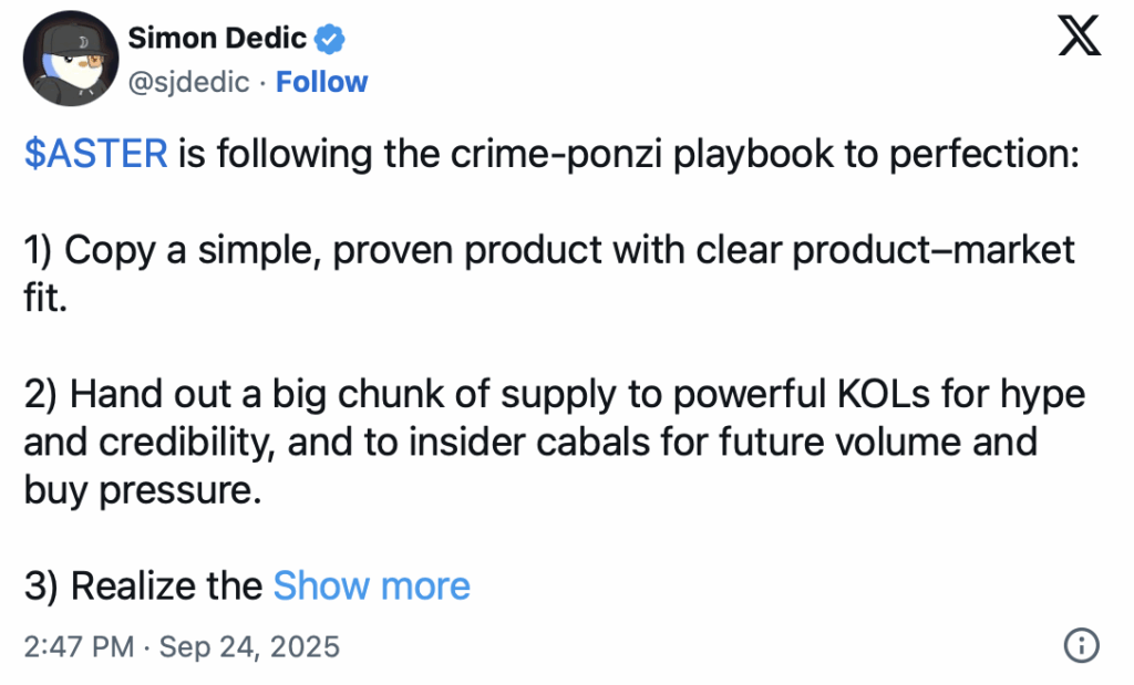 Moonrock Capital管理合伙人Simon Dedic对Aster项目提出尖锐批评,指责其遵循"犯罪庞氏剧本":复制现有成功产品后,通过向影响力人物和内部团体分配大量代币制造热度;通过虚假交易夸大交易量;并通过代币经济学设计保持供应控制。
