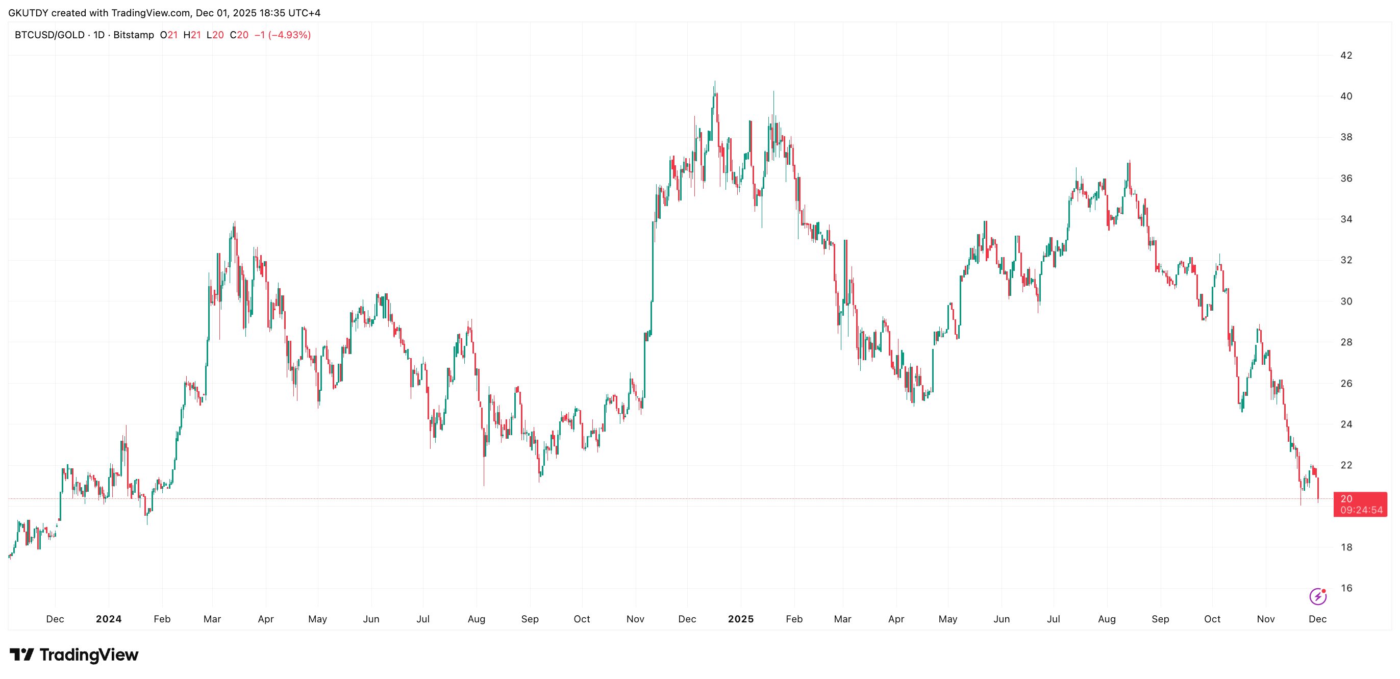 萨博此时发表评论具有特殊意义——比特币与黄金的比值在数月高于30后刚刚跌至20出头,这让黄金支持者获得了宣称胜利的最佳时机。但从长远来看,加密货币的前景依然乐观。如果黄金的失败源于托管机构的控制,而比特币的整套设计正是为了消除这种风险,那么黄金相对表现的每次飙升,就愈發不像是对金属本身的肯定,而更像在提醒人们最初创造数字 bearer 资产的初衷。