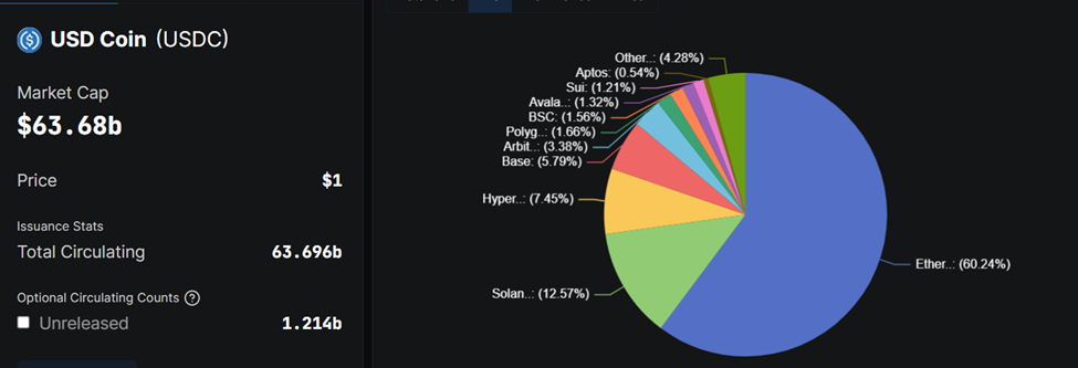 当谈到规模和采用率时,USDC仍占据绝对优势。DeFiLlama数据显示,USDC市值高达636.8亿美元,并在以太坊(60.24%)