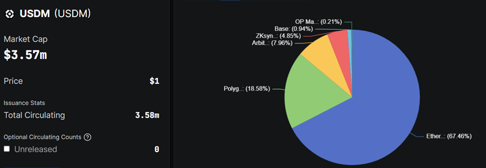 反观USDM目前市值仅357万美元,流通量358万枚,主要部署在以太坊(67.46%)和Polygon(18.58%)
