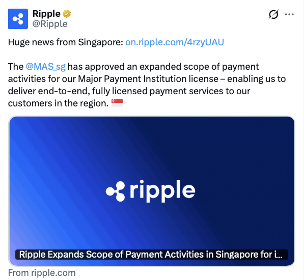 Ripple周一宣布:“新加坡金融管理局已批准我们主要支付机构牌照的扩展经营范围,使我们能够为该地区客户提供端到端的全牌照支付服务。”