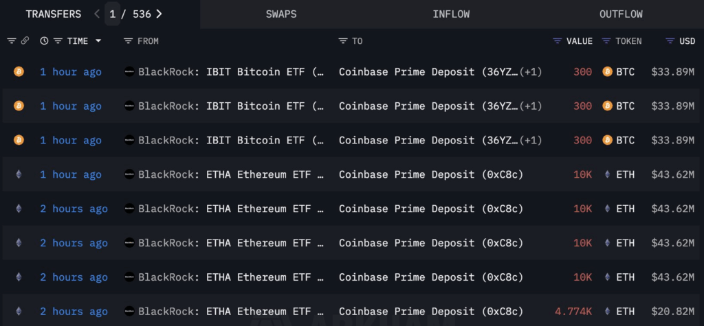 今年5月末至6月初,贝莱德曾向Coinbase Prime转移5,362枚BTC(5.61亿美元)同时增持27,241枚ETH(6900万美元)。8月中旬又转移1,885枚BTC(1.12亿美元)和59,606枚ETH(2.54亿美元)。最近一次9月3日的调仓中,该公司卖出1.514亿美元ETH并买入2.9亿美元BTC。