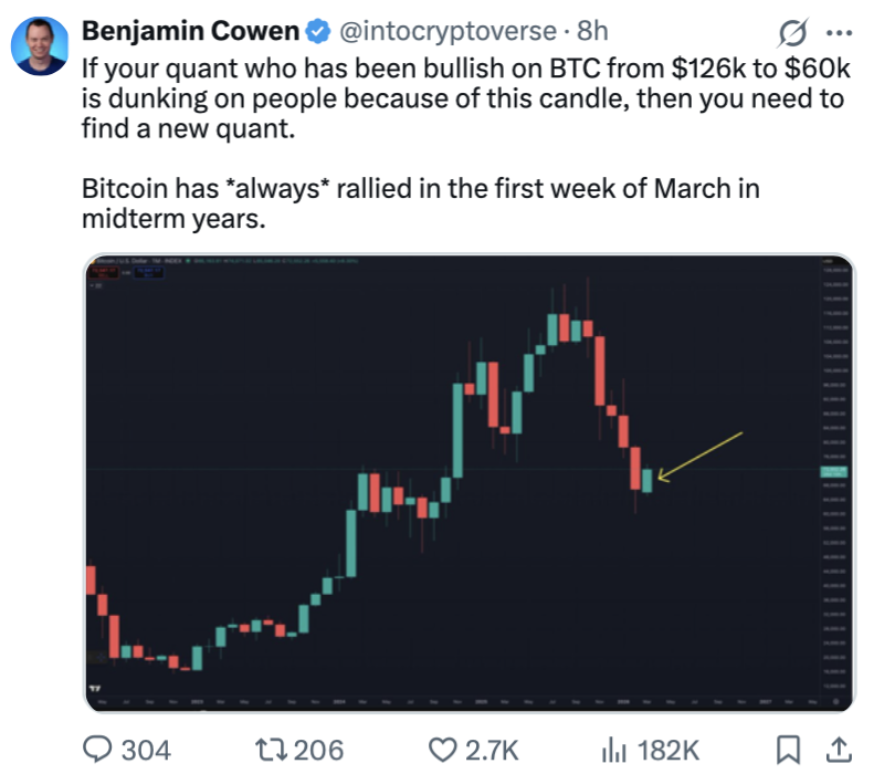 比特币在2025年10月达到12.6万美元的历史高点后进入下跌趋势,其价格在2月一度跌至6万美元,近期才回升至7万美元以上。考恩在思考,熊市是否就简单地定义为2025年10月到2026年10月。