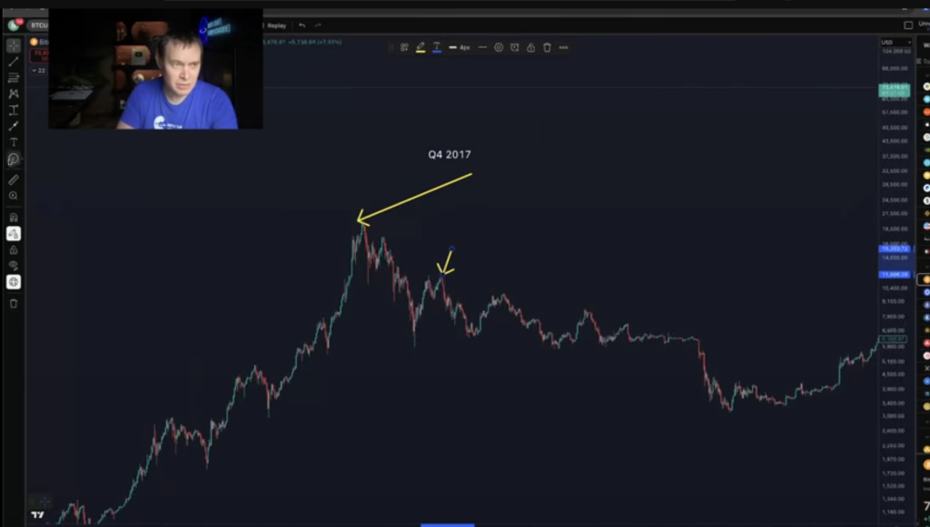 “所以在2021年和2017年,比特币是在狂热中见顶。当你在狂热中见顶,当出现抛物线式上涨时,资金就会轮动到高风险资产,比如山寨币。”他解释道。