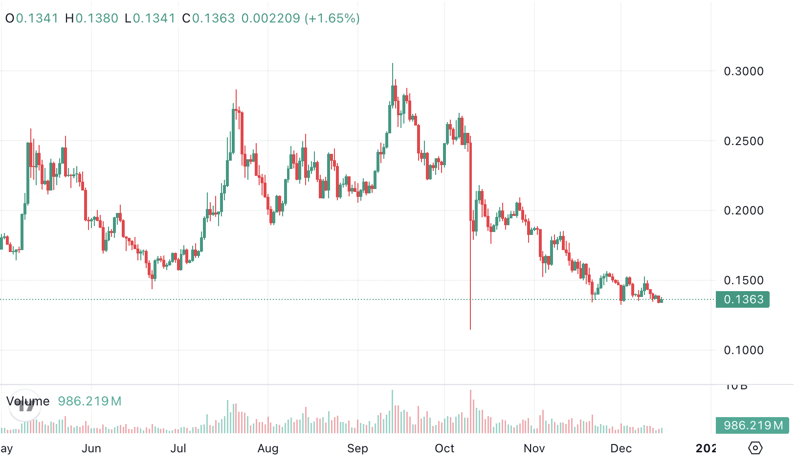 从技术层面看,12月12日狗狗币跌破0.1407美元支撑位后遭遇大规模抛售。交易量激增348%达到11.1亿枚,价格则回落至0.1372美元。这一走势呈现了由清算驱动的经典恐慌性抛售案例。
