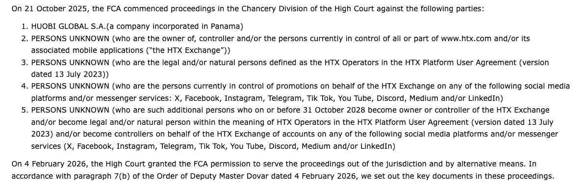 英国金融行为监管局表示,已于2025年10月向高等法院大法官法庭提起诉讼,被告包括HTX及多名相关人士。监管机构在周二发布的更新中称,已于周三获得许可,可通过替代方式在英国境外送达案件,并指出HTX(原名火币全球站)注册于巴拿马。