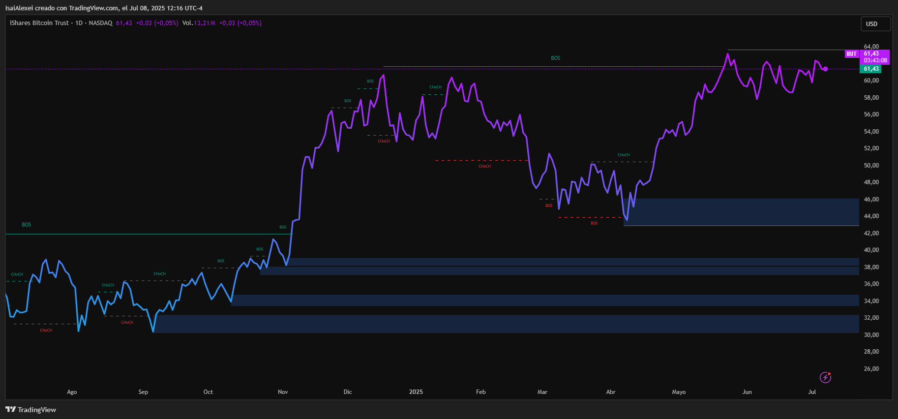 IBIT正在历史高点下方形成延续形态。突破64.50美元或将同步触发比特币站上11万美元关口,短期目标看向67.90-70.50美元区间。下方59.80美元构成支撑位,更宏观支撑与BTC在103K美元的CME缺口重合。