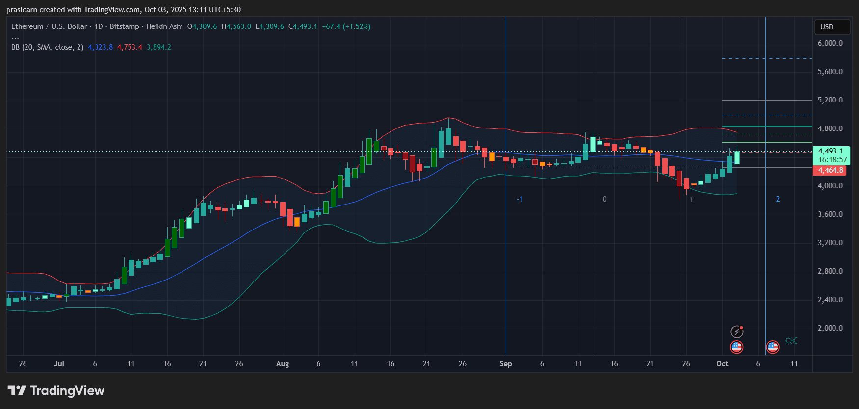 以太坊正处于十字路口:日线图显示看涨复苏信号,但政府停摆干扰美联储决策进程——这对ETH下一阶段走势至关重要。若停摆迅速解决或私营数据促使美联储转向宽松,ETH可能上探5,200美元;但若政治僵局持续且美联储按兵不动,则可能再次下探4,300美元。交易者当前需警惕波动加剧,密切关注布林带指标与美联储政策信号。