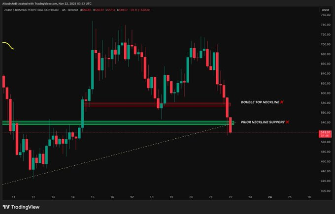 ZEC跌破了两道颈线支撑和一条趋势线,表明价格将继续向流动性更低区域移动。分析师观察到ZEC未能守住双顶形态颈线后出现强劲看跌动能,确认了结构转变。尽管面临抛压,ZEC仍是隐私板块崛起叙事的一部分,持续吸引机构关注。