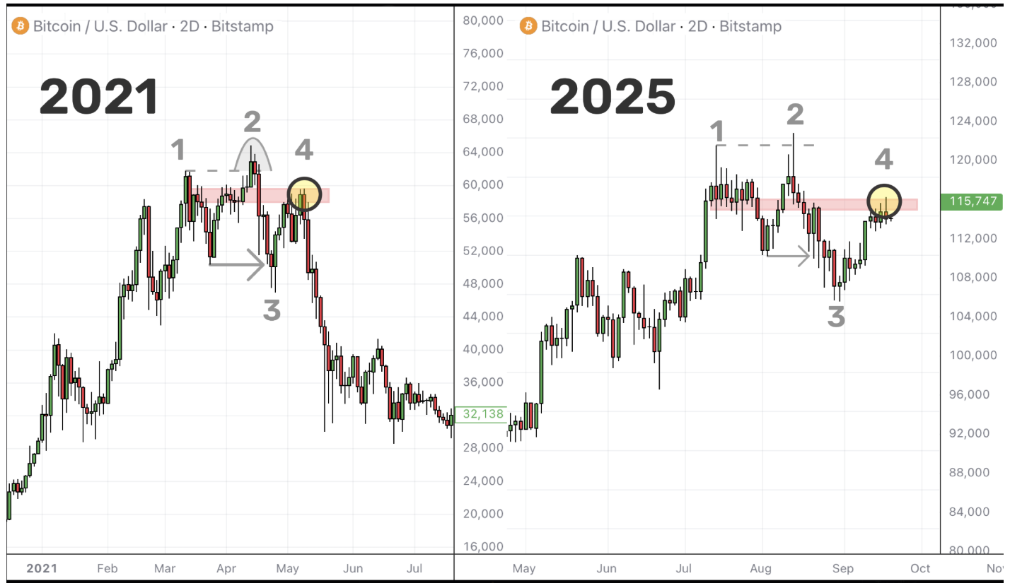 加密分析师指出比特币可能正在复制2021年的价格走势。当时比特币在冲击阻力位失败后暴跌超50%。目前周线图上升楔形形态的破位,暗示价格可能滑向60,000至62,000美元区间。部分专家甚至预警可能下探50,000美元,显示比特币正处在关键牛熊分界线上。