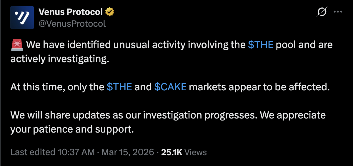已联系 Venus Protocol 寻求置评,但在发稿前尚未收到回复。