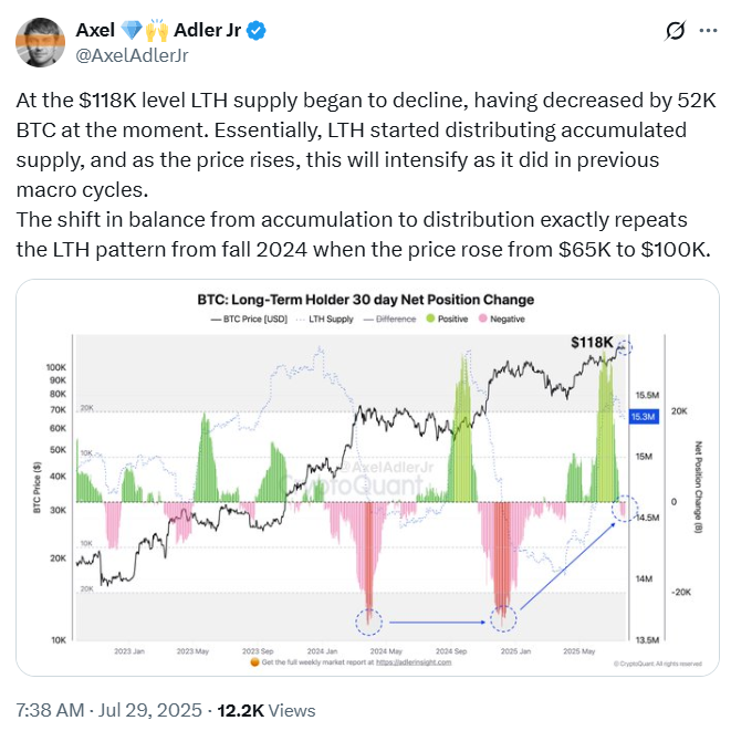 分析师Axel Adler Jr利用CryptoQuant数据显示,在比特币达到118,000美元价位时,长期持有者总供应量减少了52,000枚BTC。这一重大转变打破了数月的稳定积累态势,表明长期持币者正在获利了结。