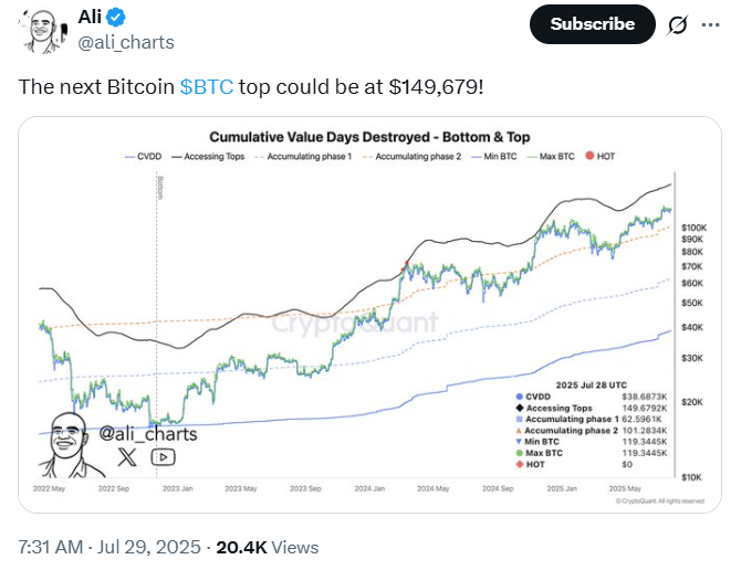 尽管出现抛售,部分分析师仍认为上涨空间存在。加密分析师Ali Martinez通过CVDD模型指出,比特币下一顶部可能位于149,679美元附近。该模型通过追踪长期活动数据和周期峰值进行预测。