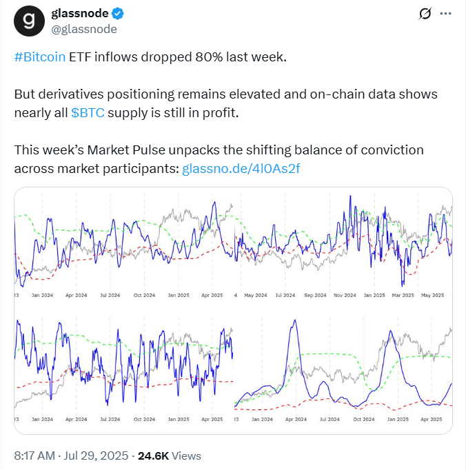伴随价格高位震荡,比特币ETF上周资金流入骤降80%至4.96亿美元,交易量也下滑至187亿美元。