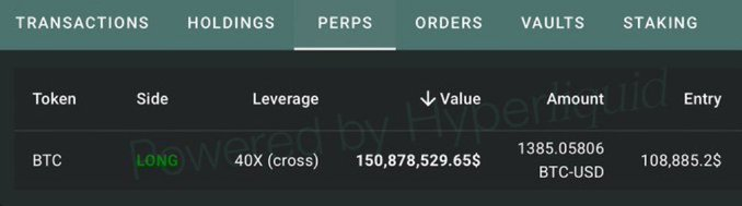 一笔1.5亿美元的多单在108,885美元建仓,表明巨鲸对比特币突破11万美元关口充满信心。