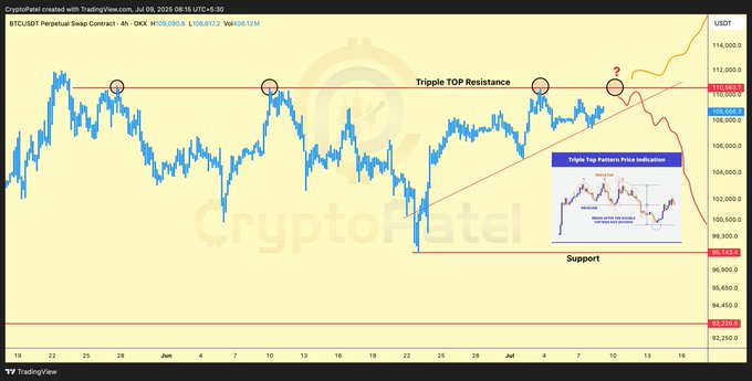 11万美元的三重顶阻力可能将BTC价格推至12万美元或回落至9.3万美元支撑位。
