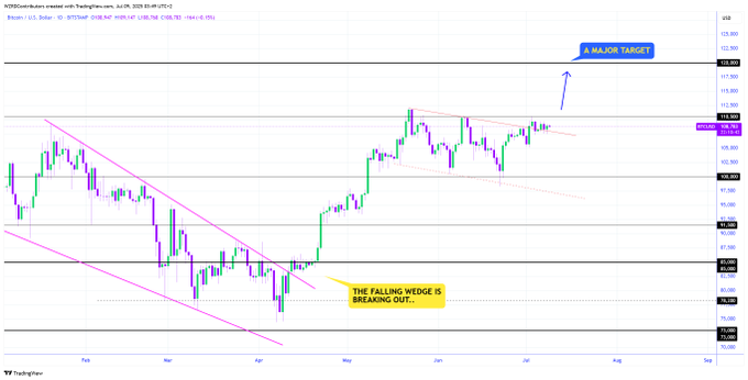 比特币价格已突破下降楔形形态,正逼近长期阻力区。
