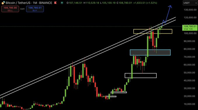 月线蜡烛在宏观阻力下方持续收紧。若比特币突破该位置,垂直上涨至13万美元可能性大增。当前市场结构与此前大涨前的突破周期高度相似。