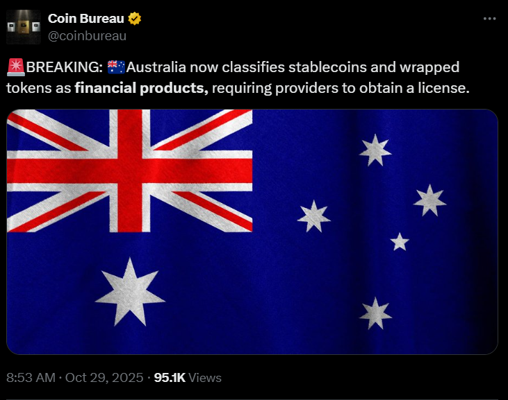 澳大利亚十月出台新规要求加密企业持牌经营,并首次将封装代币和稳定币纳入金融产品范畴。