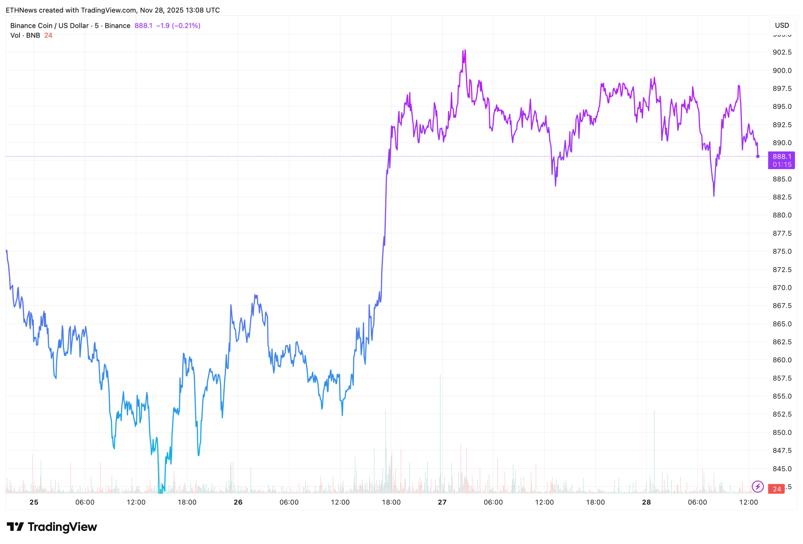 TradingView最新日内数据显示,BNB在885-900美元区间震荡,昨日强劲反弹的推动力正在消退。价格冲高905美元后迅速失速,5分钟图正形成更低的高点,显示买方在阻力位前渐显疲态。