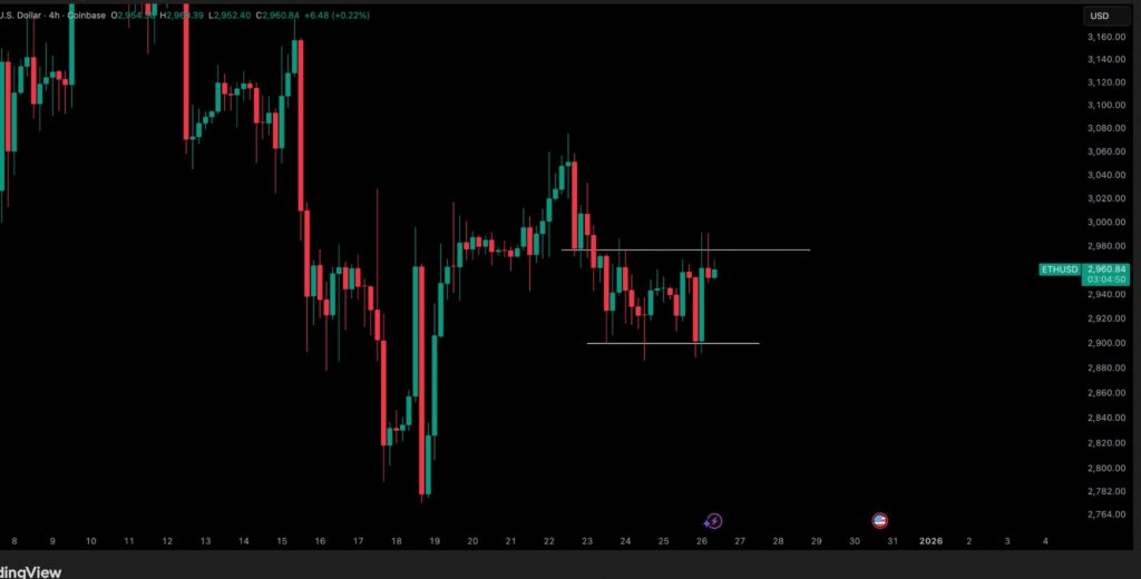 在较短时间框架内,以太坊价格走势显现疲态。分析师Lennaert指出1小时图显示下行趋势明显,以太坊在2990美元附近屡次遭遇阻力。价格近期已跌破2900美元关口,这意味着支撑位失守。这种伴随更低低点和波动率降低的形态表明,以太坊短期内可能持续面临下行压力。