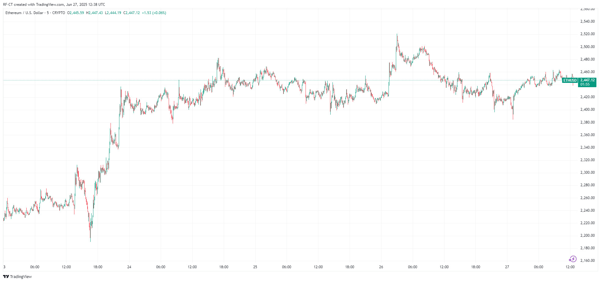 当比特币测试阻力位时,以太坊($ETH)同样未能给出明确方向。ETH现报2,450美元,勉强维持在2,400美元支撑位上方——该点位一旦失守,可能引发市场普跌。