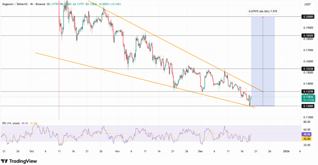 四小时图表显示狗狗币价格仍运行于下降楔形通道内,目前价格在0.12美元下轨附近获得支撑后反弹。截至撰稿时,DOGE价格徘徊于0.128美元楔形支撑线上方,呈现复苏迹象。