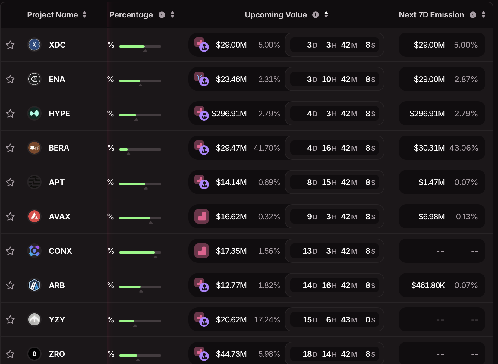 BERA在短期内承受的相对压力最高。2947万美元的解锁相当于流通量的41.70%,而其七日释放比例更高达43.06%。从稀释角度看,这使BERA明确处于更高风险范畴。