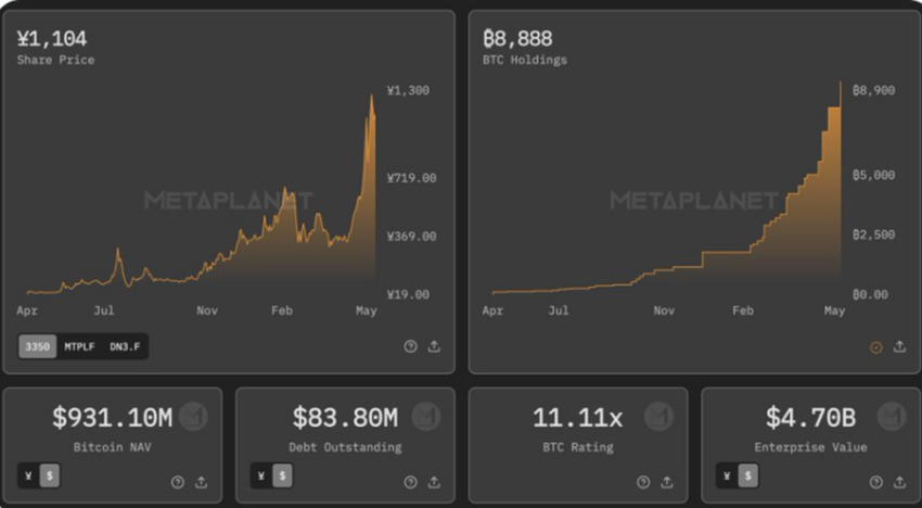 该帖文展示了Metaplanet的比特币战略:持有8,888枚BTC(价值47亿美元),股价¥1,1604,比特币市值¥9.311亿。1111倍的比特币评级反映其相对于资产净值的溢价,表明市场对比特币作为国库资产的强烈信心。