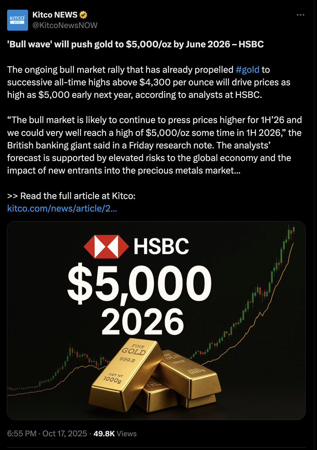 尽管市场对黄金涨势持观望态度,汇丰银行仍保持乐观,预测到2026年金价可能达到每盎司5,000美元。该行认为地缘政治紧张、经济不确定性和美元走弱是支撑黄金需求的主要因素。