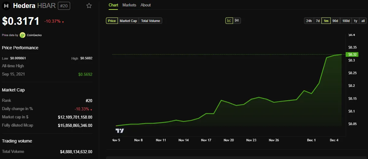 然而,儘管有此消息,Hedera Hashgraph的HBAR代幣卻大幅下跌10%。據悉,截至發稿時,HBAR的交易價格為0.3171美元。
