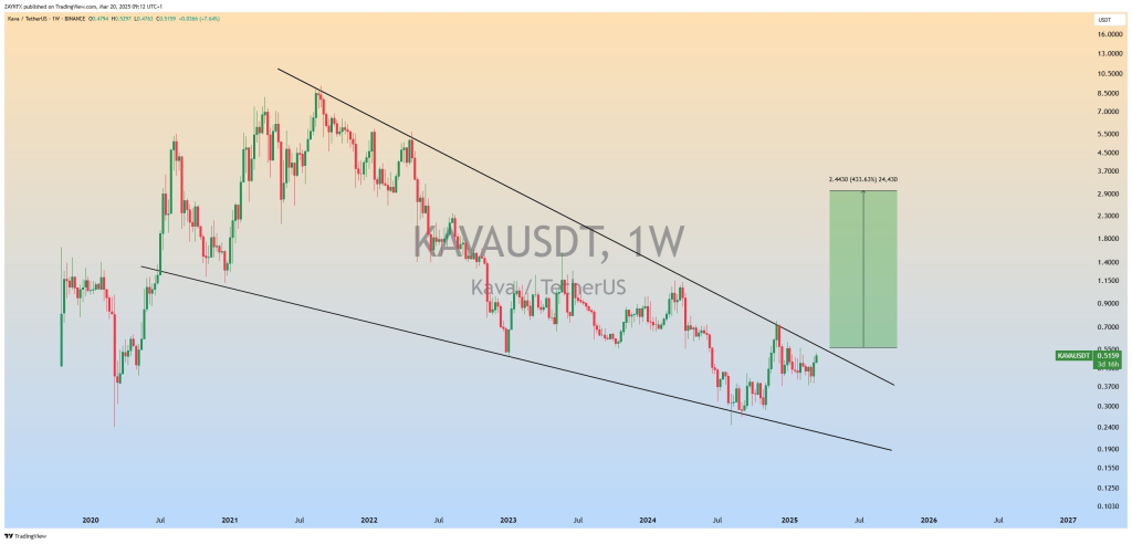 近年来,KAVA价格持续下跌,在楔形形态内形成更低的高点和更低的低点。然而,最近的价格走势表明,可能会形成潜在的突破,这可能导致价格大幅上涨。楔形的上沿线连接了从2021年到2025年出现的较低高点。